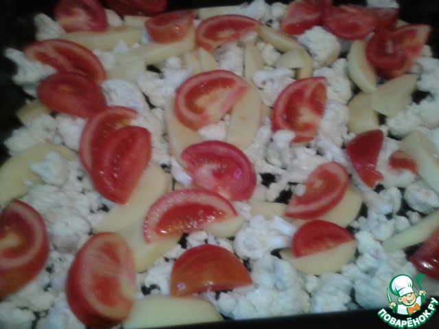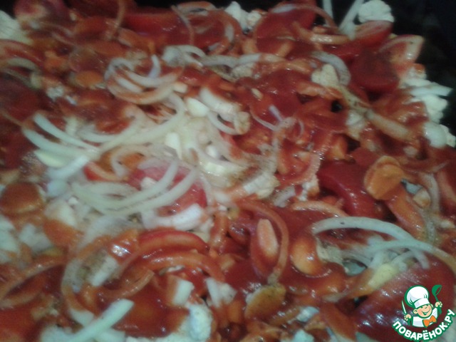 Заливаем томатным соком, добавляем воду, соль, сахар, специи и отправляем в духовку 180' на ~50 мин.