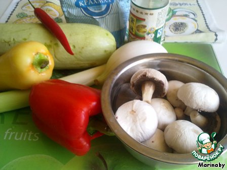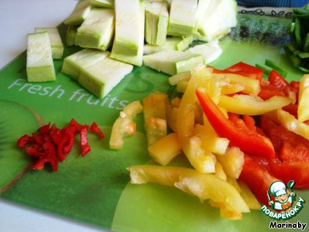 Перец освободить от плодоножек и семян, нарезать на полоски. Кабачки разрезать вдоль, а затем поперек. Перец чили можно вымочить в кипяченой воде, для тех кто не любит острое=)