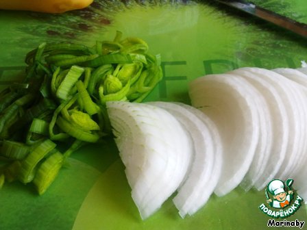 Лук нарезать полукольцами, лук-порей (зеленую часть) полосочками.