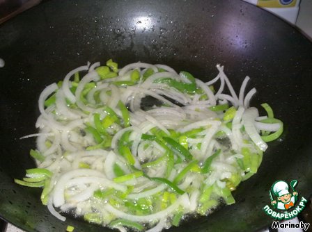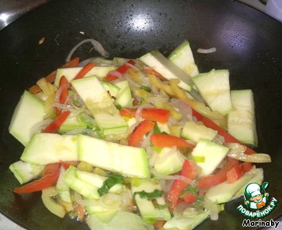 затем - перцы. Овощи необходимо постоянно перемешивать, они должны обжариваться, а не тушиться и остаться на вкус чуть недожаренными.