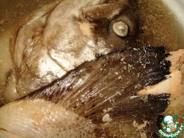 Начнем приготовление ризотто с варки бульона - промоем рабу, удалим жабры и зальем водой (1 литр), доведем до кипения, снимем пену, посолим и убавим огонь. Варим еще 30 минут, процеживаем - нам нужен только бульон.
