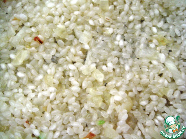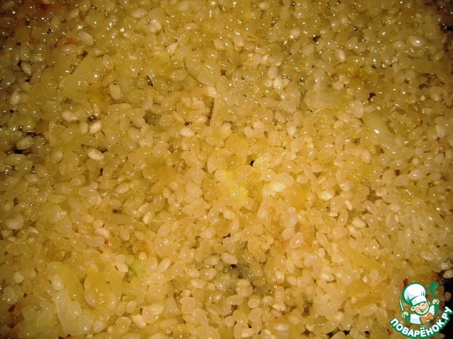 Когда лук станет прозрачным добавим рис, прогреем до прозрачности рисинок - чтобы они впитали в себя масло