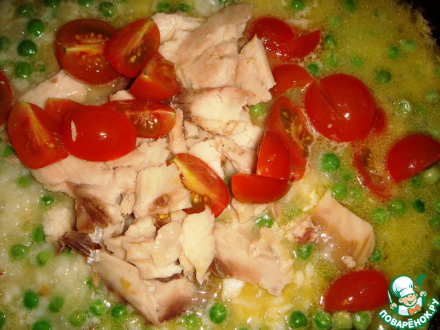 Ризотто с зеленым горошком, помидорами черри и копченым угрем