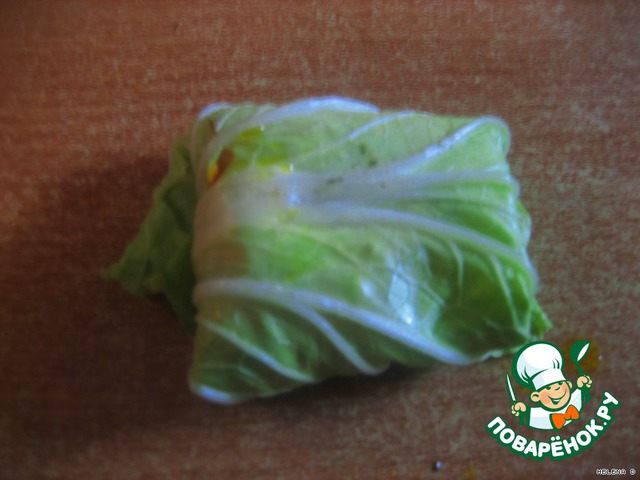 Выкладываем нашу начинку на капустные листы и заворачиваем в конвертики