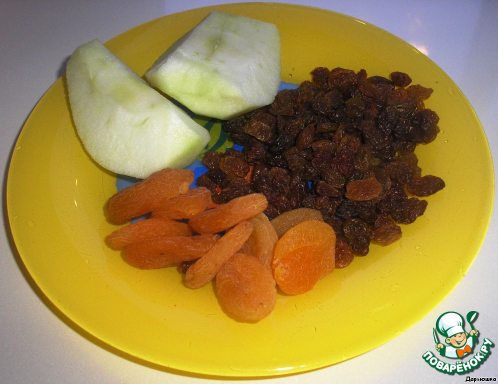 Подготовим яблоко и сухофрукты. Яблоко лучше брать жесткое, чтобы сохранило форму. Яблоко режем кусочками, курагу - мелко.