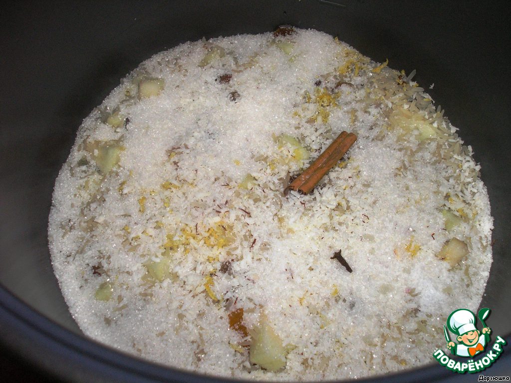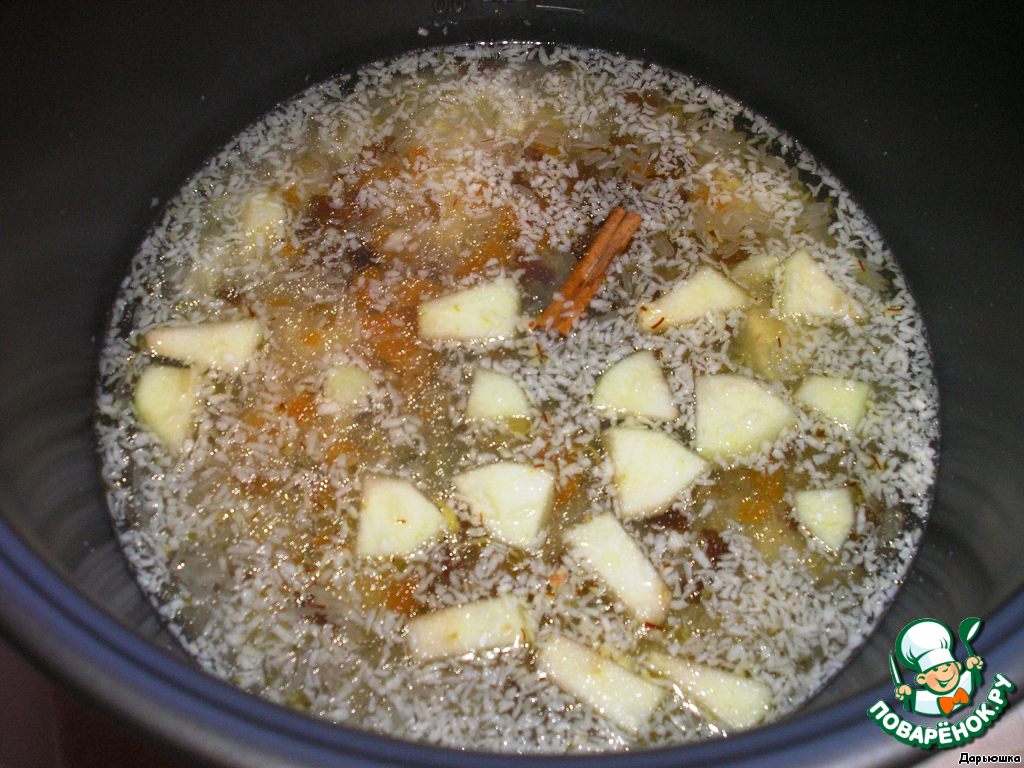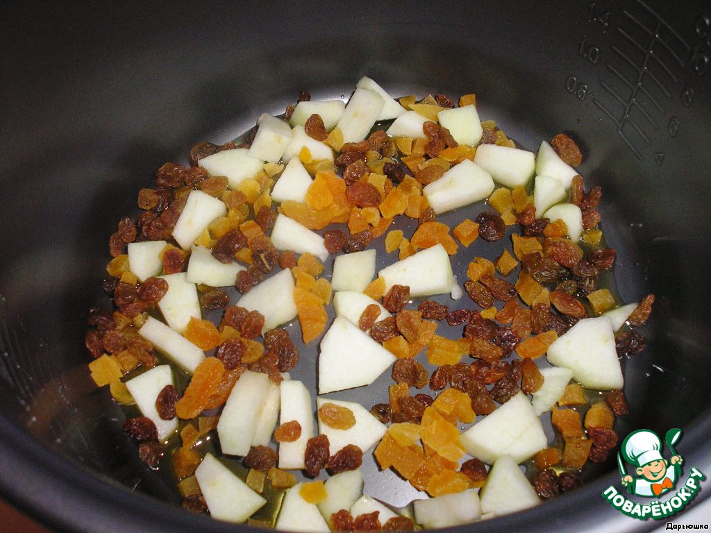 Выкладываем в кастрюлю от мультиварки масло, затем яблоко, курагу, изюм.