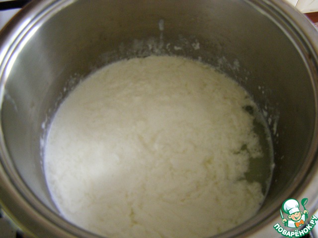 Нагреть так, чтобы начала отделяться сыворотка. Творожная масса начнет сжиматься к центру кастрюльки. Самый главный процесс завершен. Закрыть крышкой и дать постоять минут 30.
