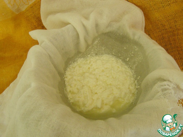 Далее надо содержимое вылить в марлю, сложенную в 4 раза, подвесить или, если нет такой возможности, просто аккуратно отжать.