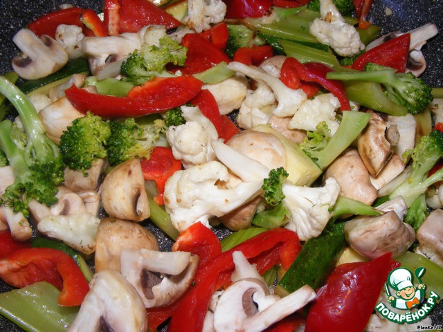 Брокколи и цветную капусту разбираем на соцветия, цуккини и сельдерей режем большими кусками. Обжариваем на сковородке 5 минут.