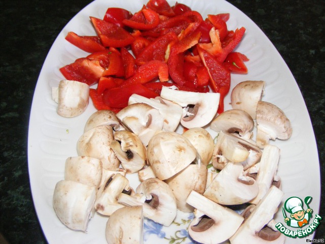 Шампиньоны режем на 4 части, перец-большими кусочками. Добавляем в сковороду.