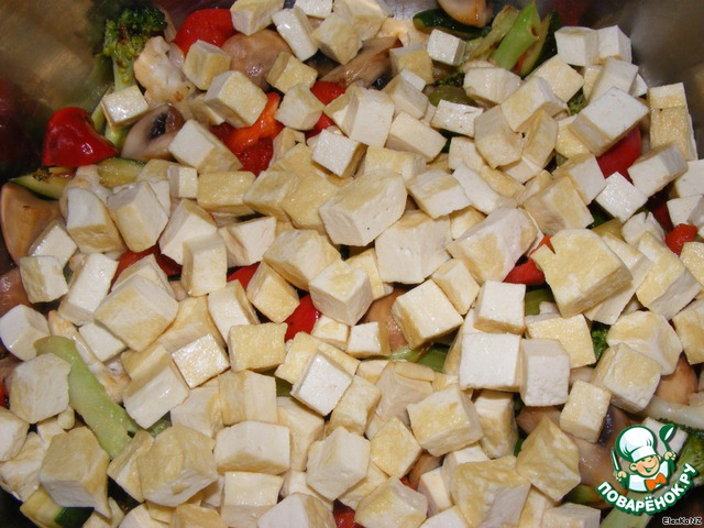 Добавляем тофу к овощам.