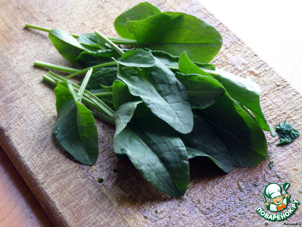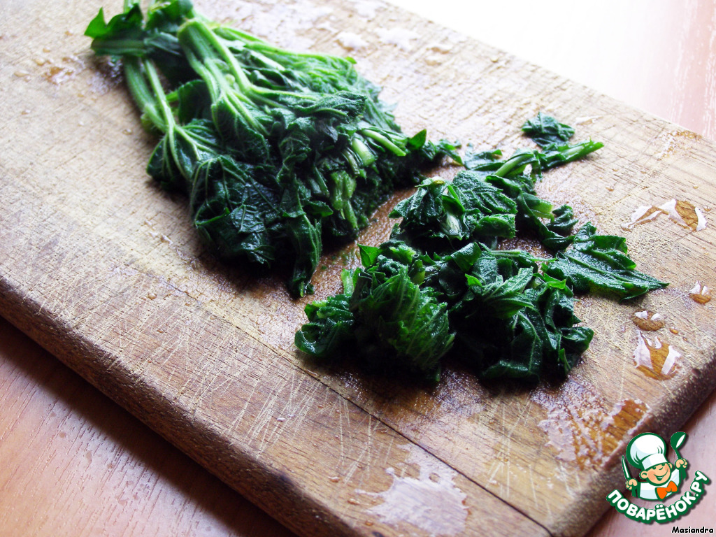 Свежий щавель нарезаем таким же размером, как и зелень крапивы с одуванчиков.
