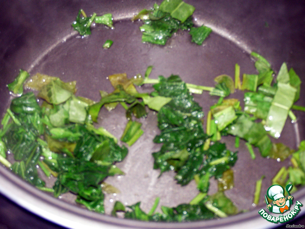 В мультиварку налить немного растительного масла, выложить зелень и слегка пассеровать.