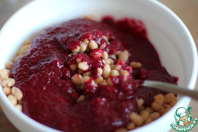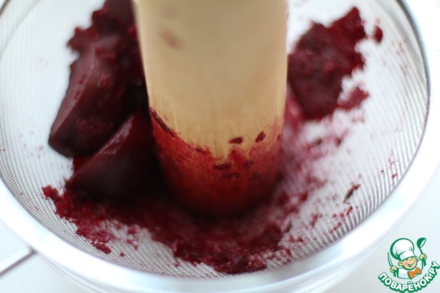 Итак, свёкла и фасоль сварились. С фасоли сольём жидкость, если осталась. Свёклу почистим и измельчим погружным блендером или протрём через сито. (у меня блендер барахлит, поэтому протирала через сито. Чтоб протирка прошла успешно свёкла должна свариться до мягкости).