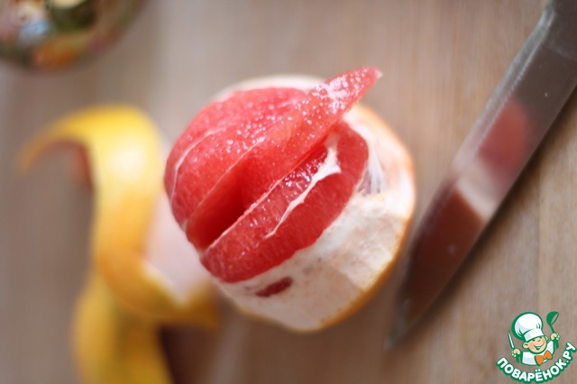 Теперь осталось выложить на блюдо и подать с долькой грейпфрута, зелёным сыром и зеленью. Как вариант сыр и грейпфрут можно порезать на кусочки и перемешать. Приятного аппетита!