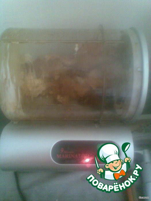 Рыбку, порезанную кусочками положить в маринатор. Туда же соевый соус, майонез, перец, и мариновать в течение 9 мин.