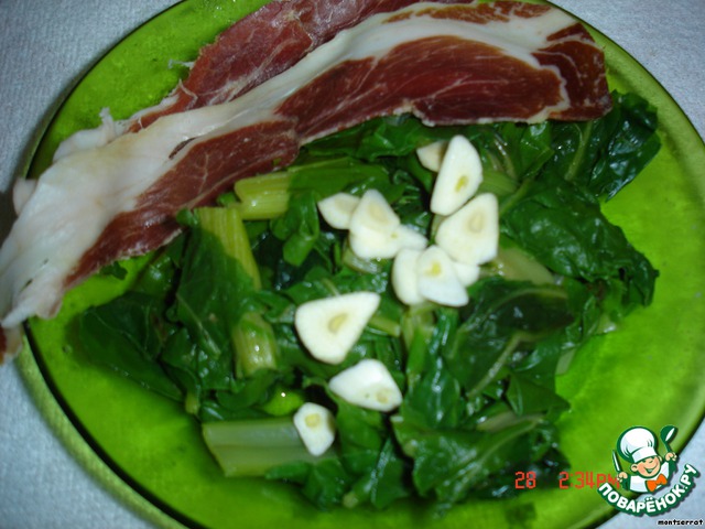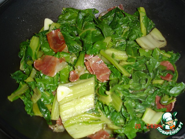 Отварные листья используем по назначению, в данном случае я буду обжаривать с чесноком и ветчиной.