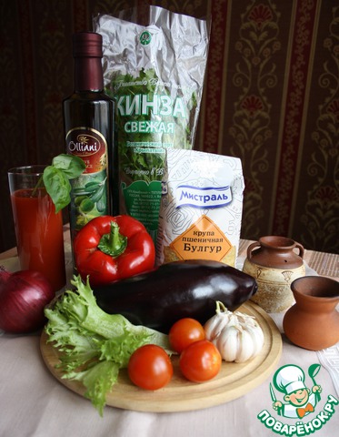 Ну вот, теперь все готово, и наше блюдо из баклажанов, перцев и булгура можно подавать с гарниром из все того же булгура, греческих маслин и оливкового масла. Ну, а сервировать все это можно на лепешке или листе лаваша. Приятного аппетита!