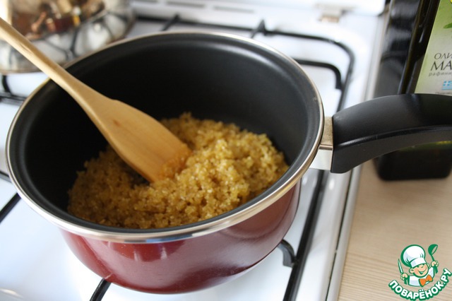 Ну а теперь (фанфары!) наш замечательный булгур, ради которого все и затевалось. Перед тем, как превратить его в дивную начинку для овощей, как и полагается по древнегреческой науке, обжарим-ка его в оливковом масле. Кстати, пахнет он при этом чем-то пронзительно-кондите рским, от чего в голову так и лезут мысли о всяких восточных сладостях, пропитанных медовым сиропом, а никак не о какой-нибудь там каше... Жарила я крупу минут 10 в двух столовых ложках масла, непрерывно перемешивая все это время. Думала, что и масла много, и время жарки меня подведет. Ничего подобного! И масла, и времени - всего оказалось в самый раз!