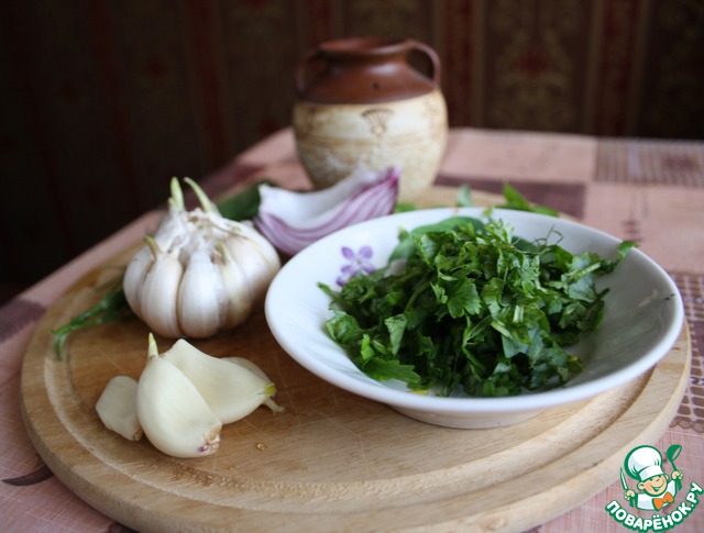 Пока грибы доходят до кондиции - режем по горсточке кинзу и базилик. Если честно, кинзу я не очень люблю, особенно в свежем виде. Но, поверьте, в содружестве с баклажанами она прекрасна! Еще одна приправа, никогда не бывающая лишней ни с баклажанами, ни с шампиньонами, - чеснок.