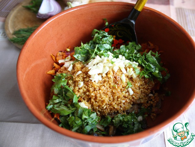 Собираем все начинки. Перемешиваем грибы, обжаренные овощи и булгур, добавляем зелень и чуть-чуть аджики.