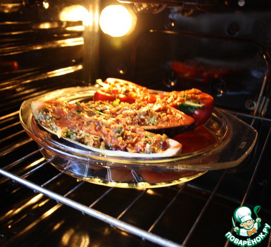 Фаршируем этой начинкой баклажаны. У меня фарша получилось чуть больше, чем нужно, поэтому пришлось на противень к "синеньким" подбросить еще и болгарский перчик.