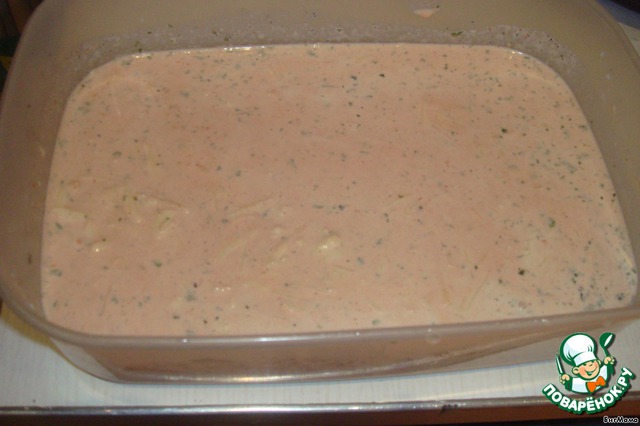 4. Делаем заливку. Тертый сыр перемешиваем со сливками, молоком, давленым чесноком, томат-пастой, мускатным орехом, солью и любимыми приправами.
