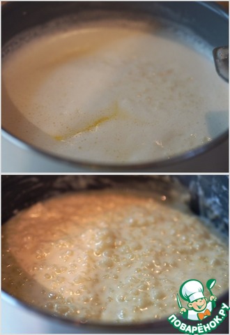 Залить крупу холодным молоком и дать закипеть. Затем добавить 1ст. л. сливочного масла и варить, пока не загустеет. У меня на это ушло 15-20 минут.