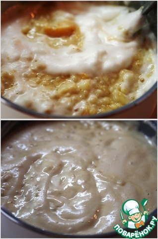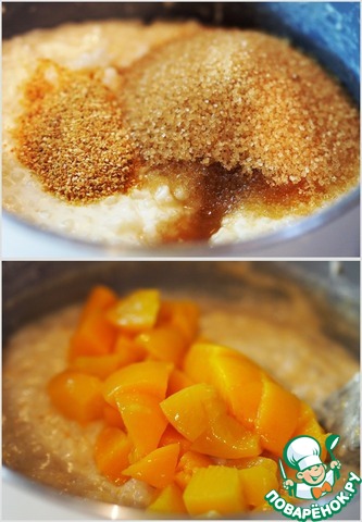Слегка остудить крупяную смесь и добавить в кастрюлю тростниковый сахар, цедру, коньяк (по желанию, - но мой подарок готовился для взрослой девочки, поэтому у меня такое желание было!!)), растертые желтки и порезанные на мелкие кусочки консервированные персики (обязательно отложите для соуса половину персиков). Хорошенько всё размешать.