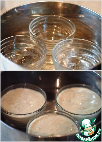 Выложить массу в формочки и поставить в пароварку на 1 час. Т. к. у меня нет пароварки, то я разложила всё сразу по стеклянным креманкам и силиконовым формочкам (смазав 1ст. л. сливочного масла) и поставила в кастрюлю с кипящей водой, доходящей до половины формочек, чтобы они варились на пару.