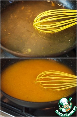 Пока готовится пудинг, сделать персиковый соус, он придаст нежный, ароматный фруктовый оттенок нашему блюду. Блендером измельчить отложенные половинки персиков. В сковороду налить сироп из-под консервированных персиков (часть оставить для растворения крахмала) и добавить сахар, если сироп у вас не очень сладкий. Прогреть почти до кипения и, интенсивно мешая, влить растворенный крахмал, и еще немного прогреть до загустения и в конце добавить измельченные персики. Всё, наш замечательный соус уже готов!