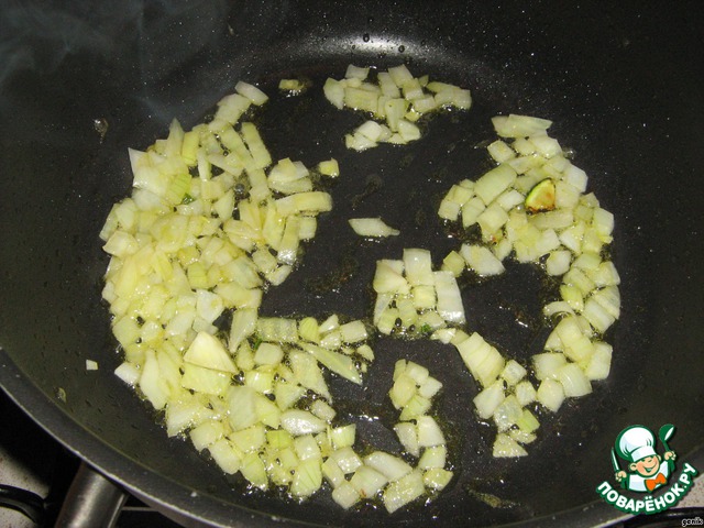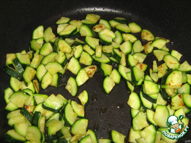 в сковороде обжариваем на оливковом масле(если не любите другое раст масло) кабачки порезаные кубиками.когда приобретут румяный цвет откладываем в другую посуду.