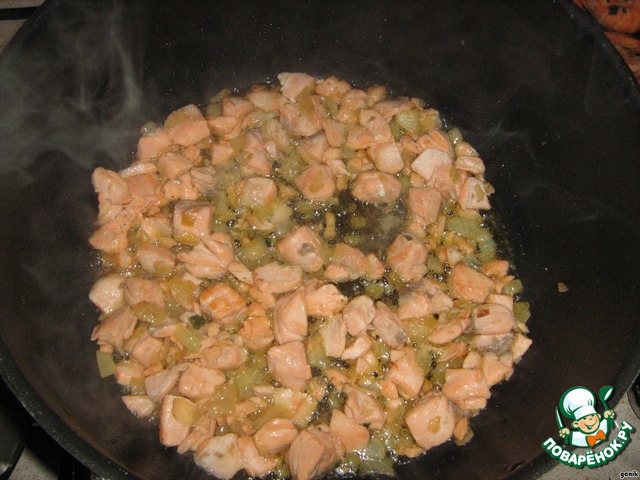 режем свежий или размороженный лосось на кубики.удаляем косточки