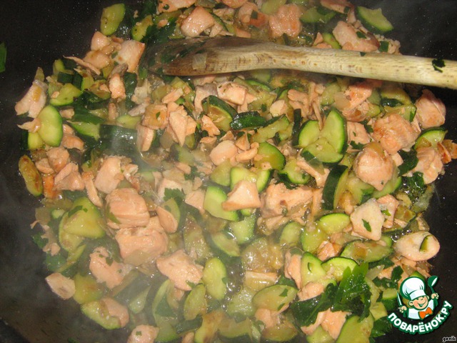 добавляем уже обжаренные кабачки.солим прчим.добавляем зелень