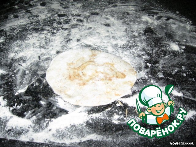 Кусочек рулетика раскатать в блин примерно 10-12 см