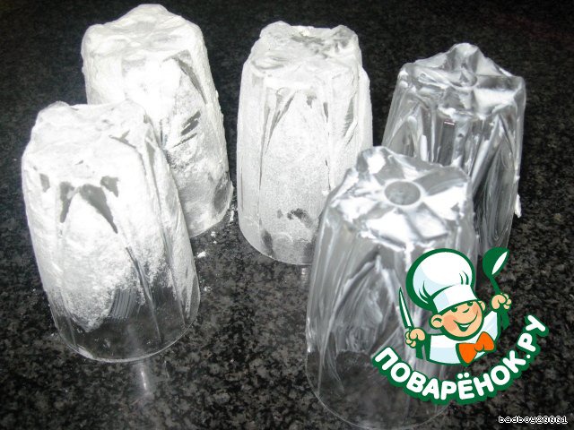 Подходящие стаканы смазать маргарином и посыпать мукой