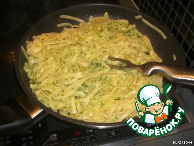 3.В лапшу добавляем песто (не обязательно сразу всё, смотрите по-вкусу), перемешиваем.