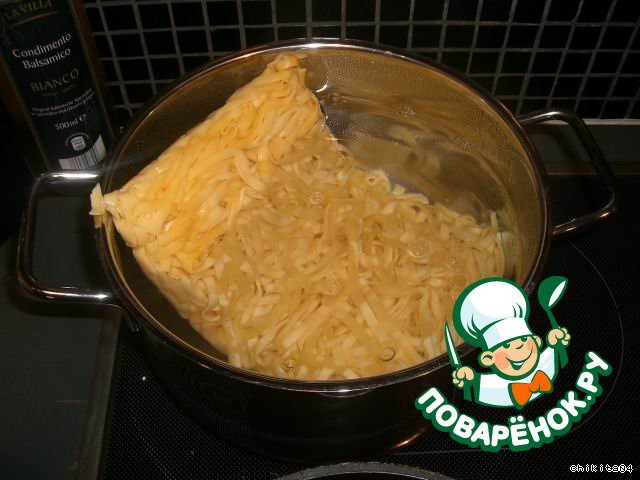1. Поставить воду для пасты. Я взяла свежие таглиателли. Для этого рецепт прекрасно подойдут другие виды итальянской лапши, как в свежем, так и в сухом виде.
