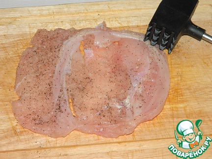 Размораживаем филе, обсушиваем, отбиваем, солим, перчим