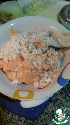 Слить воду с риса и добавить его к фаршу. Посолить, приправить специями по вкусу и все хорошо перемешать.
