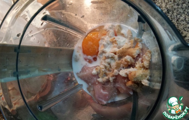 Яйцо, куриную грудку и замоченный в молоке батон измельчить в блендере.
