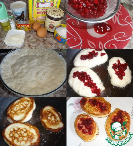 После того, как положили наши оладушки, сразу сверху на каждый положить по 1ст. ложке отцеженных ягод брусники, разровнять их по поверхности. Когда низ поджарится, перевернуть.