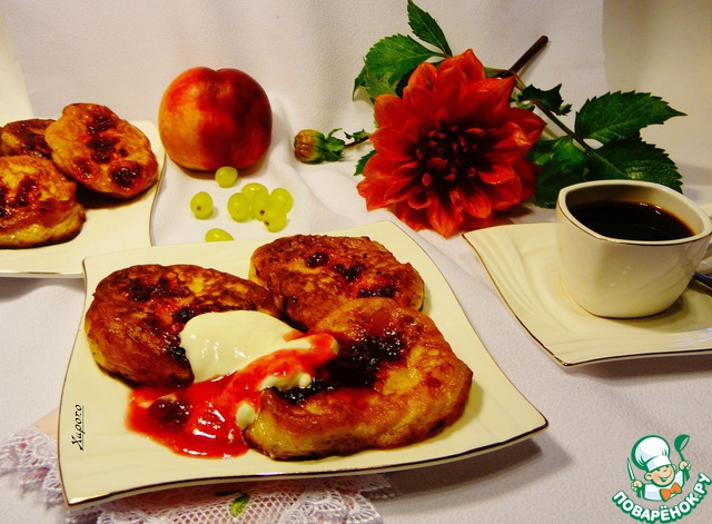 Когда все оладушки испекутся, их можно подавать со сметаной, как многие привыкли, подмешав наш отцеженный соус. Можно подавать только с одним соусом. Как вам подскажет ваша фантазия.