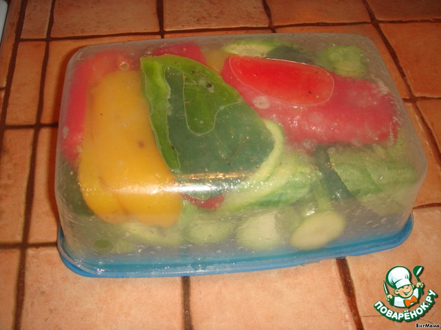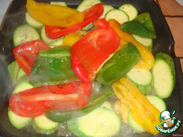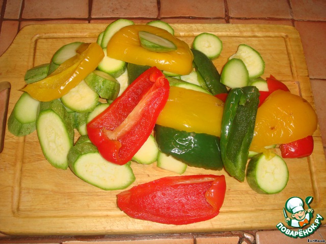 1.Овощи нарезать. Перцы - вдоль на четыре части, кабачки - продолговатыми кругами.