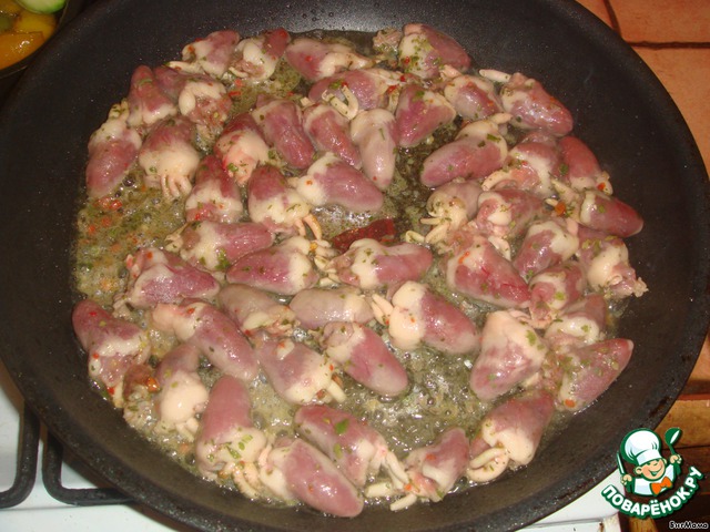 7. Тем временем, в отдельной сковороде, быстро обжариваем куриные сердца. Минут 5, не больше.