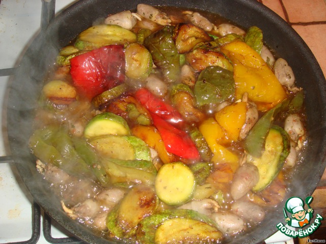 | Kуриные сердца с маринованными перцами и кабачками. |