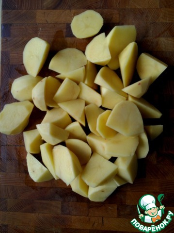 Картофель нарезать произвольно. Именно так, чтобы часть кусочка, где тонко, разварилась, а потолще - осталась целой.