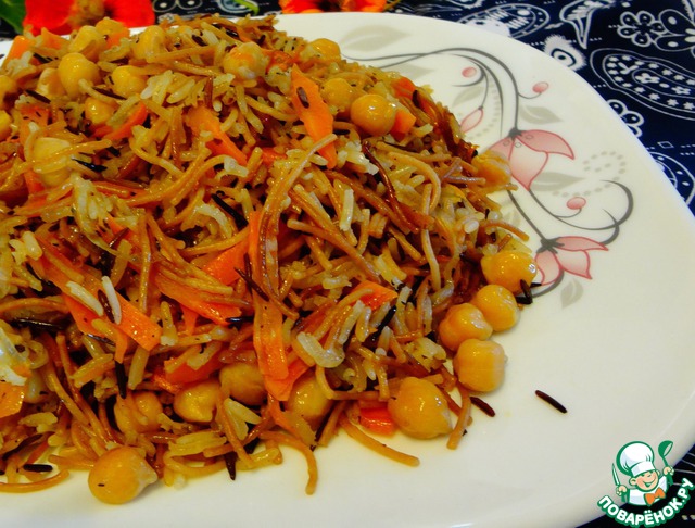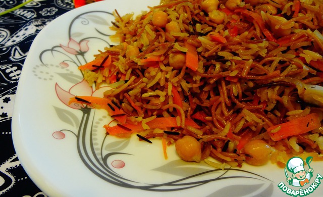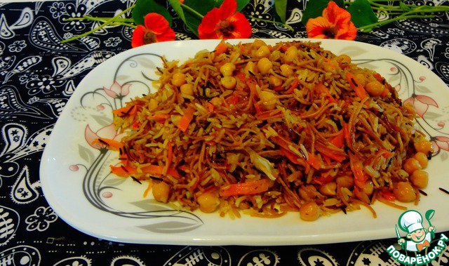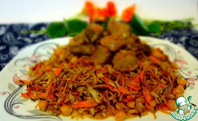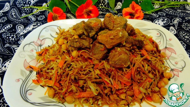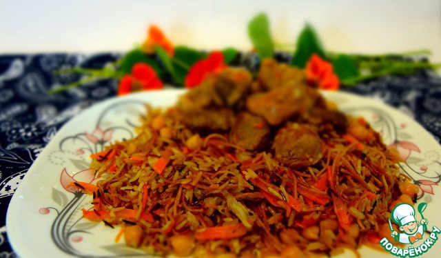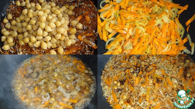 Введём замоченный заранее горох "нут". Отдельно в казане начнём обжаривать лук и нарезанную соломкой морковь. Когда лук немного поджарится, а морковь станет мягкой, введём в казан поджаренные отдельно рис с вермишелью и горохом. Зальём кипятком на 1 палец выше риса. Посолим по вкусу. Закроем крышкой и варим минут 20. Выключаем и держим под крышкой ещё минут 10.