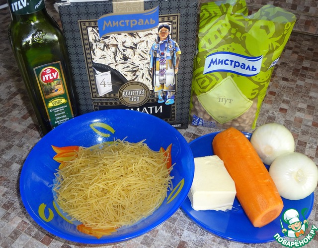 Для приготовления этого блюда нам потребуется дикий рис "Басмати mix" ТМ Мистраль (на самом деле это не совсем дикий рис. а смесь риса "басмати" и собственно дикого риса, но для краткости в дальнейшем этот рис я буду называть "диким"), вермишель " паутинка", замоченный заранее горох "нут", одна морковка, две небольшие репчатые луковицы, и масло - растительное и сливочное.