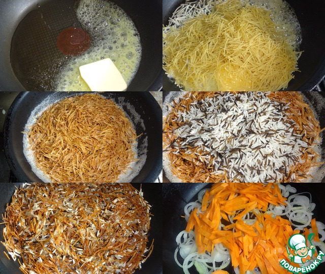 В сковороде разогреем сначала растительное масло, а потом распустим сливочное. Обжарим вермишель до нежно-коричневого цвета. Добавим к ней наш дикий рис. Немного подержим на огне до прозрачности.